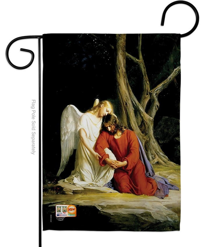 The Agony In The Garden Garden Flag is a double-sided 12.5" x 18" garden flag designed to be displayed outdoors year-round. Printed on weather-resistant polyester, the flag reads correctly from both approaches so the design works on a yard walkway, a garden bed, or a porch railing. It fits every standard 40"–46" garden flag stand on the market.