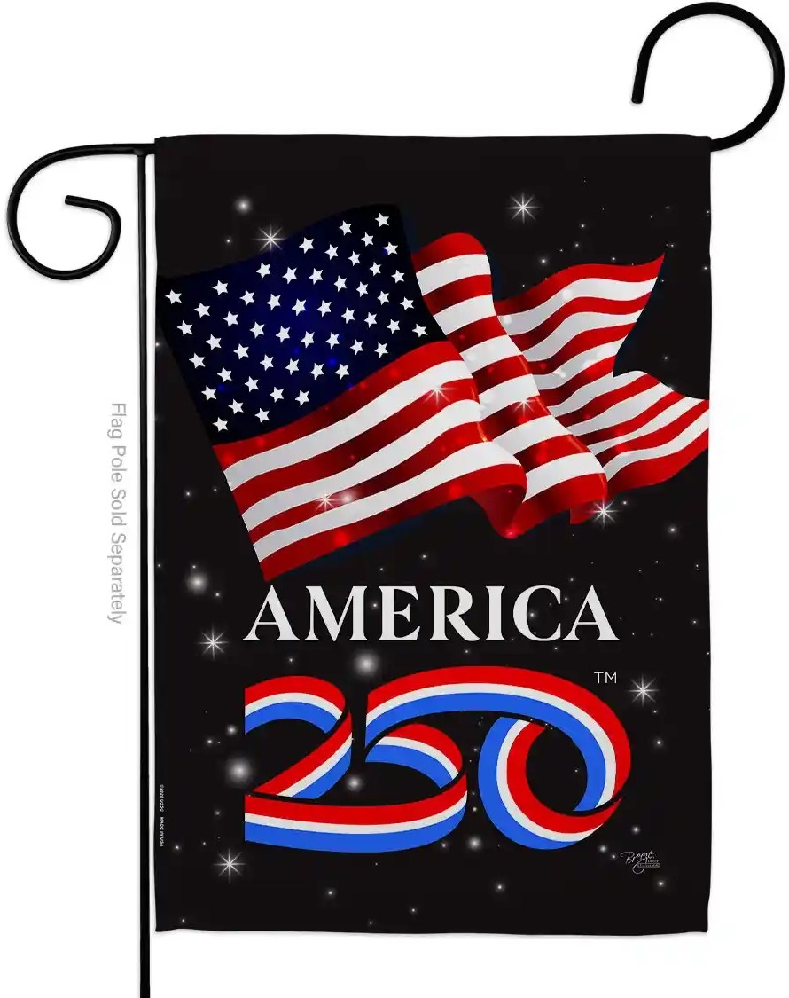 The American USA 250th Garden Flag is a double-sided 12.5" x 18" garden flag designed to be displayed outdoors year-round. Printed on weather-resistant polyester, the flag reads correctly from both approaches so the design works on a yard walkway, a garden bed, or a porch railing. It fits every standard 40"–46" garden flag stand on the market.