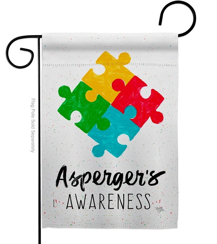 The Asperger's Awareness Garden Flag is a double-sided 12.5" x 18" garden flag designed to be displayed outdoors year-round. Printed on weather-resistant polyester, the flag reads correctly from both approaches so the design works on a yard walkway, a garden bed, or a porch railing. It fits every standard 40"–46" garden flag stand on the market.