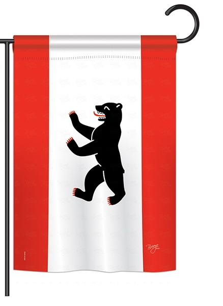 The Berlin Garden Flag is a double-sided 12.5" x 18" garden flag designed to be displayed outdoors year-round. Printed on weather-resistant polyester, the flag reads correctly from both approaches so the design works on a yard walkway, a garden bed, or a porch railing. It fits every standard 40"–46" garden flag stand on the market.