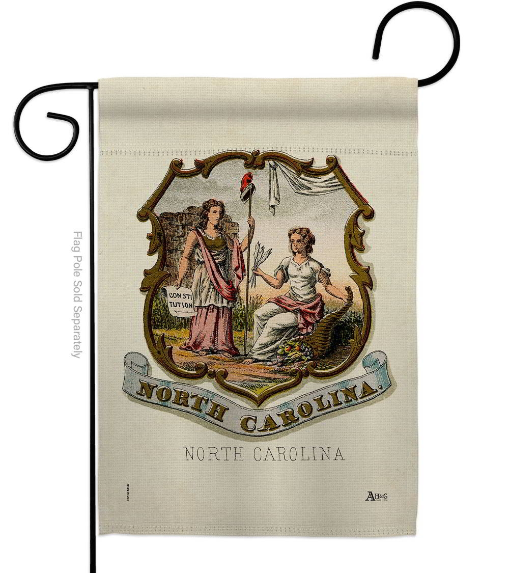 The Coat Of Arms Of North Carolina Garden Flag is a double-sided 12.5" x 18" garden flag designed to be displayed outdoors year-round. Printed on weather-resistant polyester, the flag reads correctly from both approaches so the design works on a yard walkway, a garden bed, or a porch railing. It fits every standard 40"–46" garden flag stand on the market.