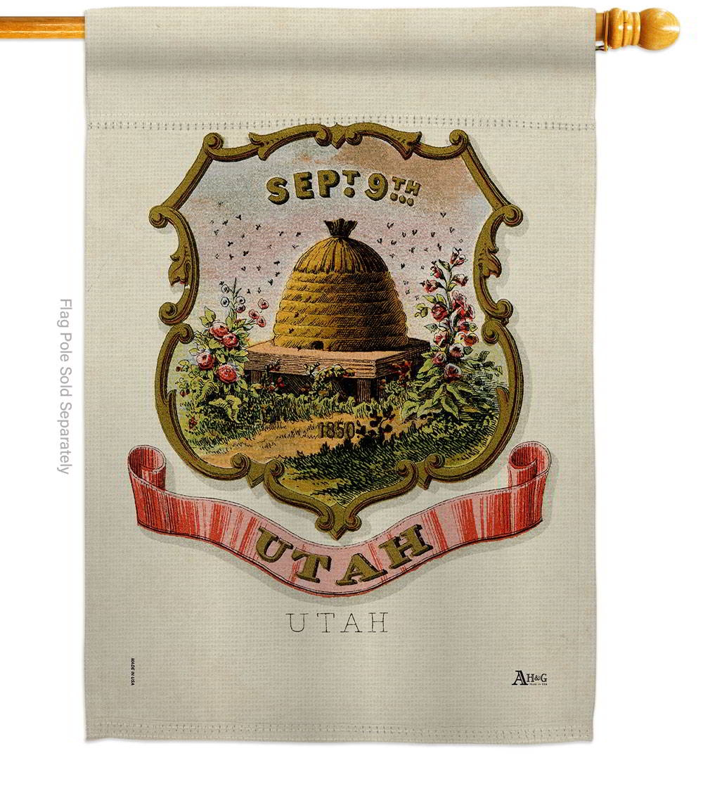 The Coat Of Arms Of Utah House Flag is a double-sided 28" x 40" house flag designed to be displayed outdoors year-round. Printed on weather-resistant polyester, the flag reads correctly from both approaches so the design works on a yard walkway, a garden bed, or a porch railing. It fits every standard 6-foot house flagpole on the market.