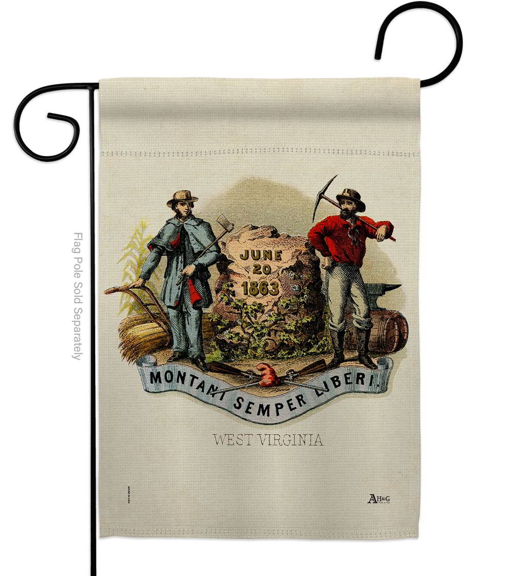 The Coat Of Arms Of West Virginia Garden Flag is a double-sided 12.5" x 18" garden flag designed to be displayed outdoors year-round. Printed on weather-resistant polyester, the flag reads correctly from both approaches so the design works on a yard walkway, a garden bed, or a porch railing. It fits every standard 40"–46" garden flag stand on the market.