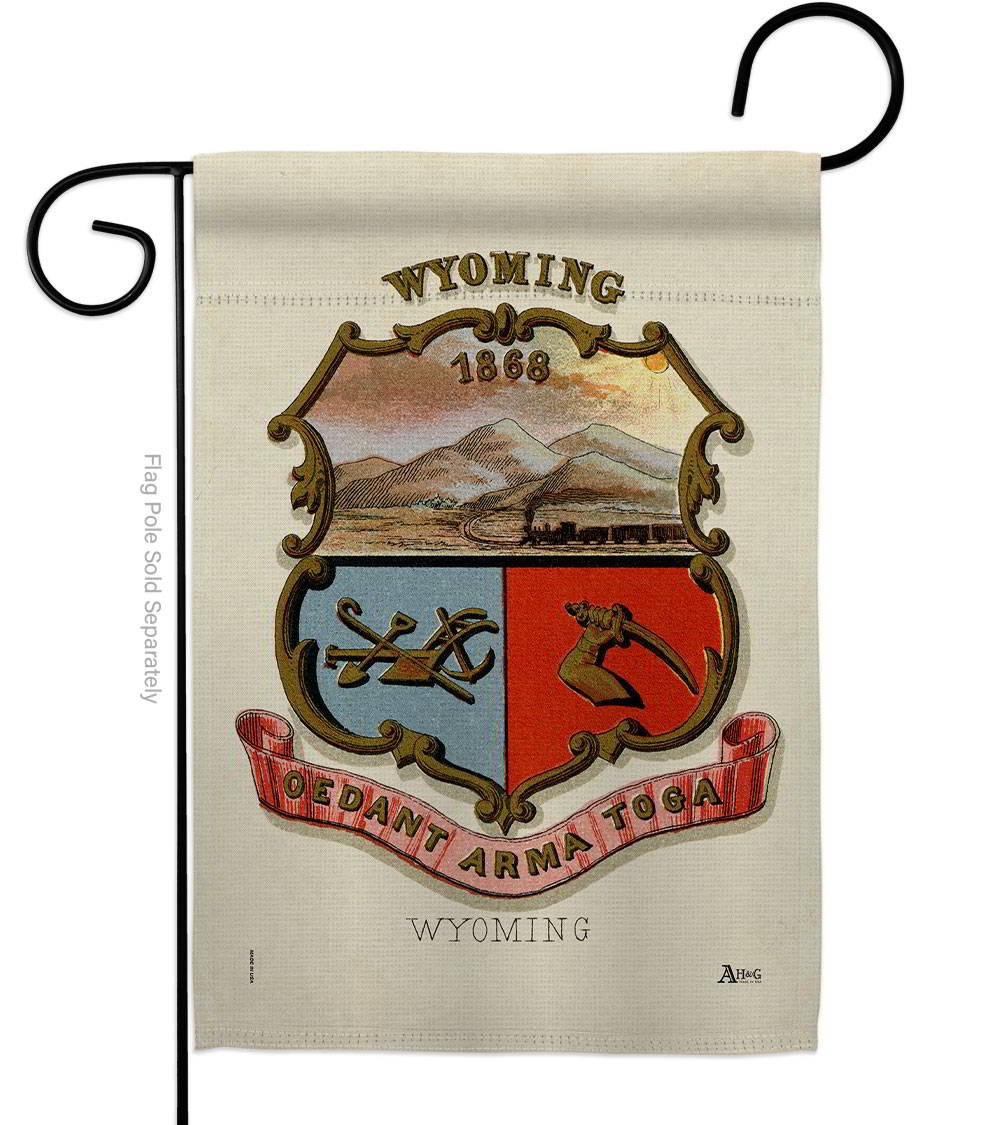 The Coat Of Arms Of Wyoming Garden Flag is a double-sided 12.5" x 18" garden flag designed to be displayed outdoors year-round. Printed on weather-resistant polyester, the flag reads correctly from both approaches so the design works on a yard walkway, a garden bed, or a porch railing. It fits every standard 40"–46" garden flag stand on the market.