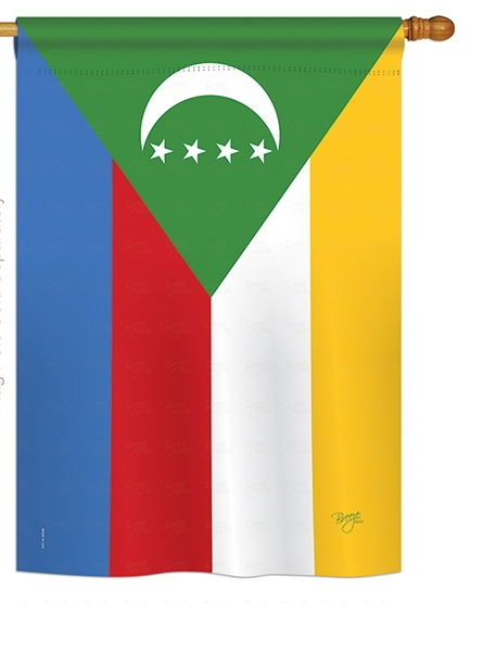 The Comoros House Flag is a double-sided 28" x 40" house flag designed to be displayed outdoors year-round. Printed on weather-resistant polyester, the flag reads correctly from both approaches so the design works on a yard walkway, a garden bed, or a porch railing. It fits every standard 6-foot house flagpole on the market.