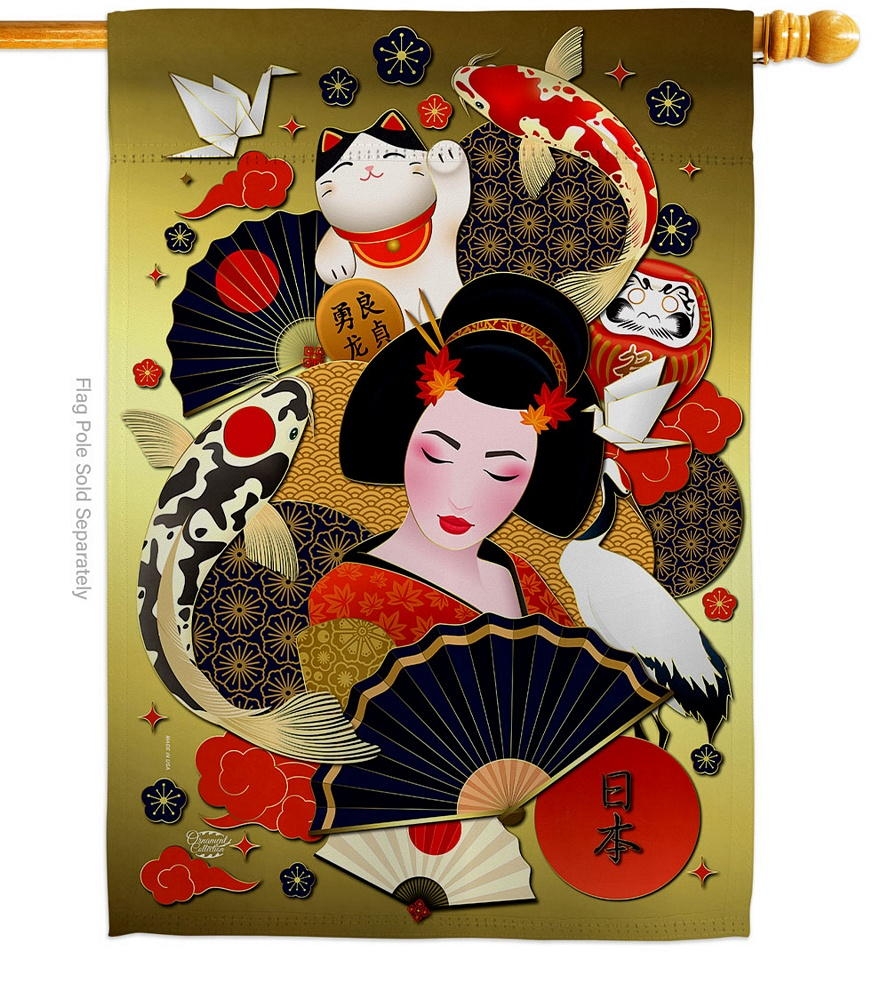 The Culture Of Japan House Flag is a double-sided 28" x 40" house flag designed to be displayed outdoors year-round. Printed on weather-resistant polyester, the flag reads correctly from both approaches so the design works on a yard walkway, a garden bed, or a porch railing. It fits every standard 6-foot house flagpole on the market.