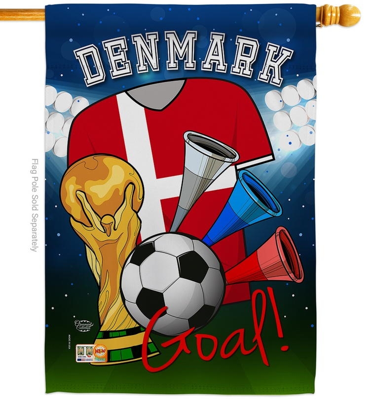 The Denmark Soccer House Flag is a double-sided 28" x 40" house flag designed to be displayed outdoors year-round. Printed on weather-resistant polyester, the flag reads correctly from both approaches so the design works on a yard walkway, a garden bed, or a porch railing. It fits every standard 6-foot house flagpole on the market.