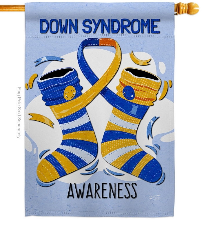 The Down Syndrome House Flag is a double-sided 28" x 40" house flag designed to be displayed outdoors year-round. Printed on weather-resistant polyester, the flag reads correctly from both approaches so the design works on a yard walkway, a garden bed, or a porch railing. It fits every standard 6-foot house flagpole on the market.