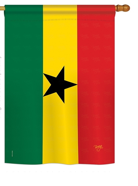 The Ghana House Flag is a double-sided 28" x 40" house flag designed to be displayed outdoors year-round. Printed on weather-resistant polyester, the flag reads correctly from both approaches so the design works on a yard walkway, a garden bed, or a porch railing. It fits every standard 6-foot house flagpole on the market.
