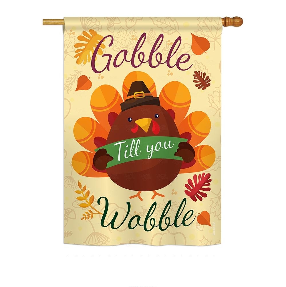The Gobble Till You Wabble House Flag is a double-sided 28" x 40" house flag designed to be displayed outdoors year-round. Printed on weather-resistant polyester, the flag reads correctly from both approaches so the design works on a yard walkway, a garden bed, or a porch railing. It fits every standard 6-foot house flagpole on the market.