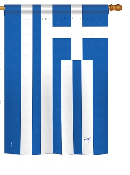 The Greece House Flag is a double-sided 28" x 40" house flag designed to be displayed outdoors year-round. Printed on weather-resistant polyester, the flag reads correctly from both approaches so the design works on a yard walkway, a garden bed, or a porch railing. It fits every standard 6-foot house flagpole on the market.