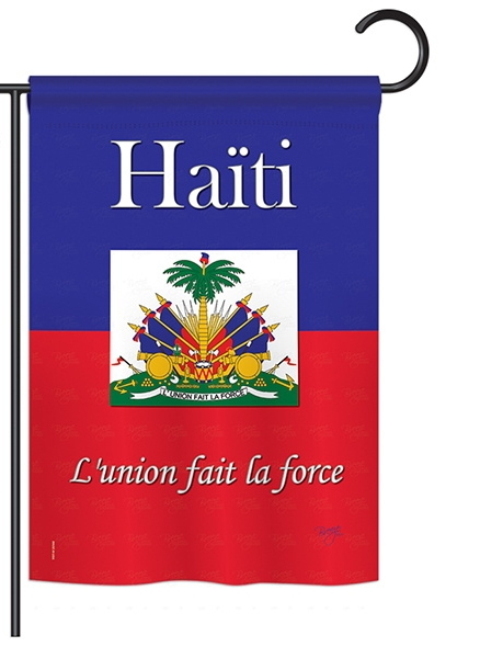 The Haiti Garden Flag is a double-sided 12.5" x 18" garden flag designed to be displayed outdoors year-round. Printed on weather-resistant polyester, the flag reads correctly from both approaches so the design works on a yard walkway, a garden bed, or a porch railing. It fits every standard 40"–46" garden flag stand on the market.