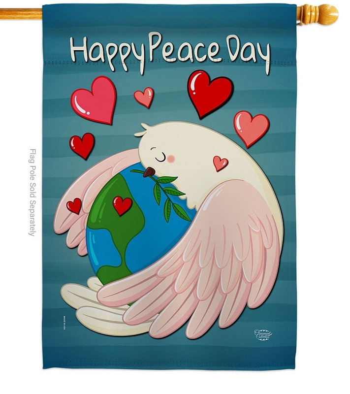 The Happy Peace Day House Flag is a double-sided 28" x 40" house flag designed to be displayed outdoors year-round. Printed on weather-resistant polyester, the flag reads correctly from both approaches so the design works on a yard walkway, a garden bed, or a porch railing. It fits every standard 6-foot house flagpole on the market.