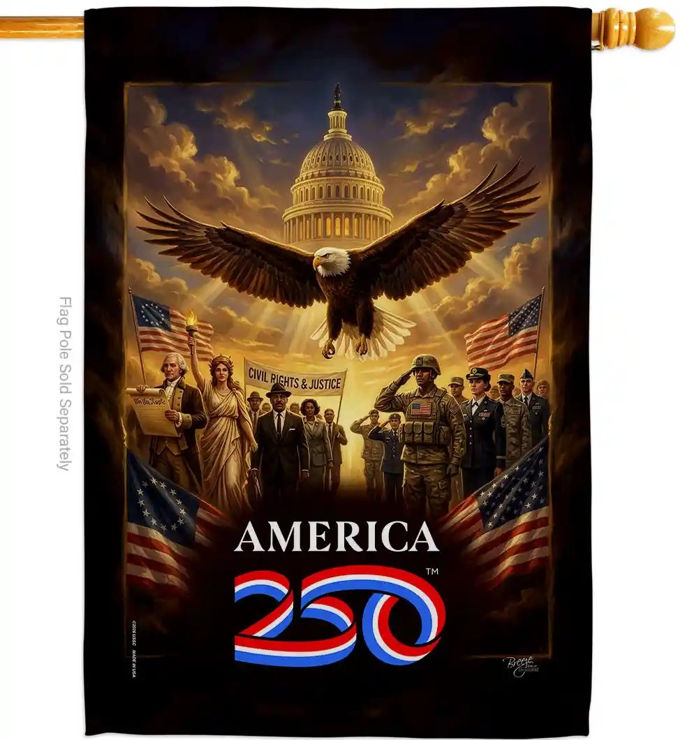 The Justice & Service USA 250 House Flag is a double-sided 28" x 40" house flag designed to be displayed outdoors year-round. Printed on weather-resistant polyester, the flag reads correctly from both approaches so the design works on a yard walkway, a garden bed, or a porch railing. It fits every standard 6-foot house flagpole on the market.