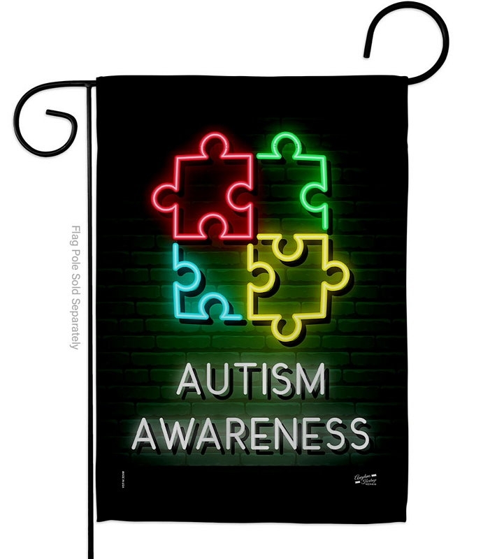 The Neon Autism Garden Flag is a double-sided 12.5" x 18" garden flag designed to be displayed outdoors year-round. Printed on weather-resistant polyester, the flag reads correctly from both approaches so the design works on a yard walkway, a garden bed, or a porch railing. It fits every standard 40"–46" garden flag stand on the market.