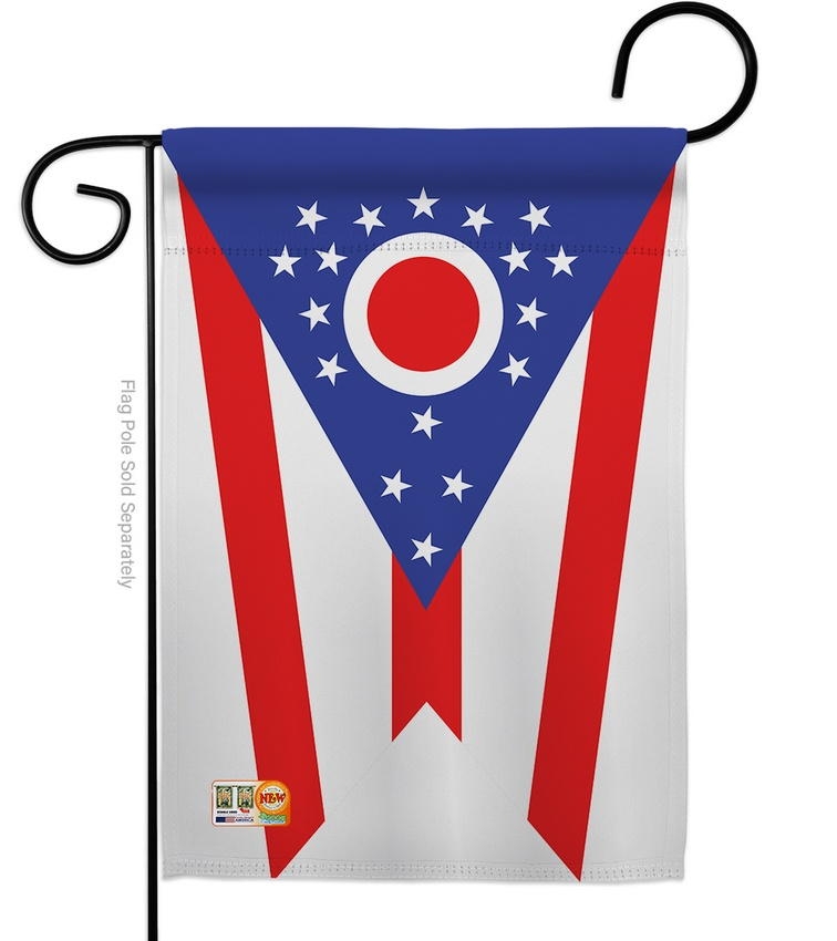 The Ohio Decorative Garden Flag is a double-sided 12.5" x 18" garden flag designed to be displayed outdoors year-round. Printed on weather-resistant polyester, the flag reads correctly from both approaches so the design works on a yard walkway, a garden bed, or a porch railing. It fits every standard 40"–46" garden flag stand on the market.