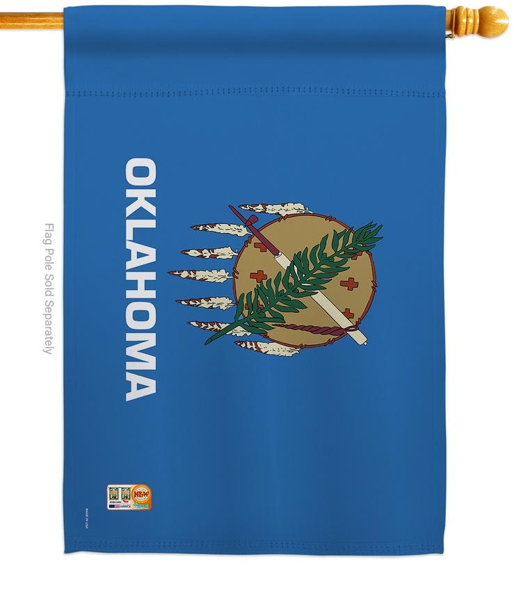The Oklahoma Decorative House Flag is a double-sided 28" x 40" house flag designed to be displayed outdoors year-round. Printed on weather-resistant polyester, the flag reads correctly from both approaches so the design works on a yard walkway, a garden bed, or a porch railing. It fits every standard 6-foot house flagpole on the market.