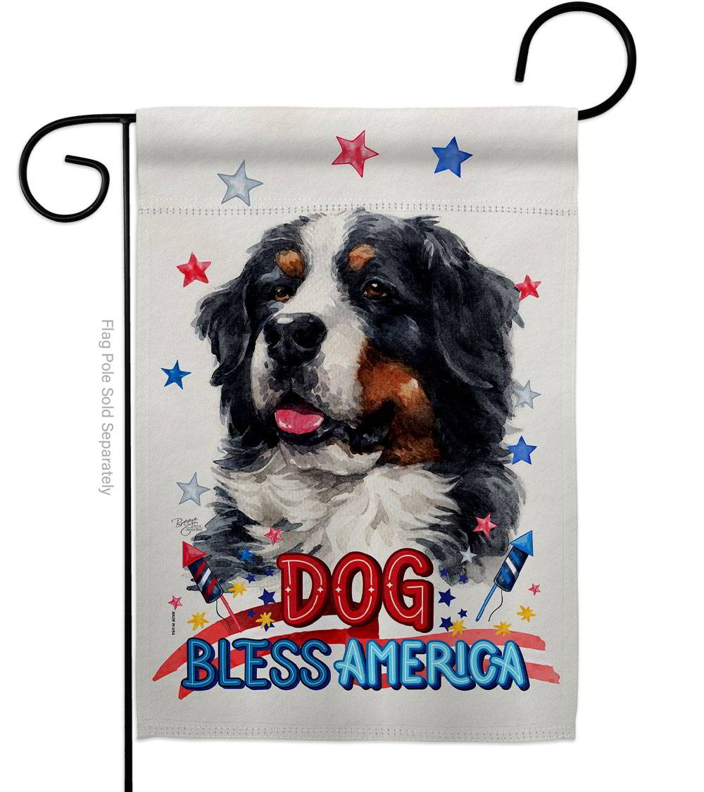 The Patriotic Bernese Cattle Garden Flag is a double-sided 12.5" x 18" garden flag designed to be displayed outdoors year-round. Printed on weather-resistant polyester, the flag reads correctly from both approaches so the design works on a yard walkway, a garden bed, or a porch railing. It fits every standard 40"–46" garden flag stand on the market.