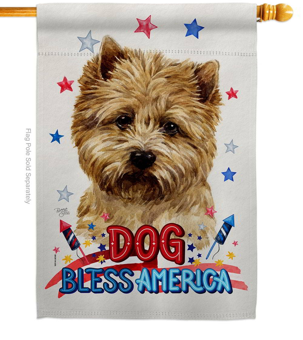The Patriotic Cairn Terrier House Flag is a double-sided 28" x 40" house flag designed to be displayed outdoors year-round. Printed on weather-resistant polyester, the flag reads correctly from both approaches so the design works on a yard walkway, a garden bed, or a porch railing. It fits every standard 6-foot house flagpole on the market.