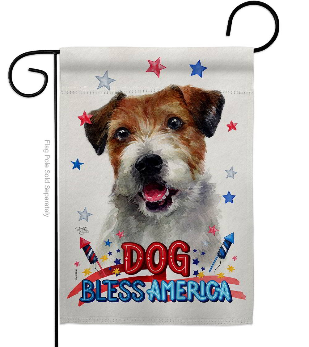 The Patriotic Parson Russell Terrier Garden Flag is a double-sided 12.5" x 18" garden flag designed to be displayed outdoors year-round. Printed on weather-resistant polyester, the flag reads correctly from both approaches so the design works on a yard walkway, a garden bed, or a porch railing. It fits every standard 40"–46" garden flag stand on the market.