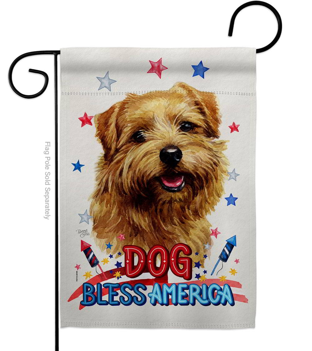 The Patriotic Tan Norfolk Terrier Garden Flag is a double-sided 12.5" x 18" garden flag designed to be displayed outdoors year-round. Printed on weather-resistant polyester, the flag reads correctly from both approaches so the design works on a yard walkway, a garden bed, or a porch railing. It fits every standard 40"–46" garden flag stand on the market.
