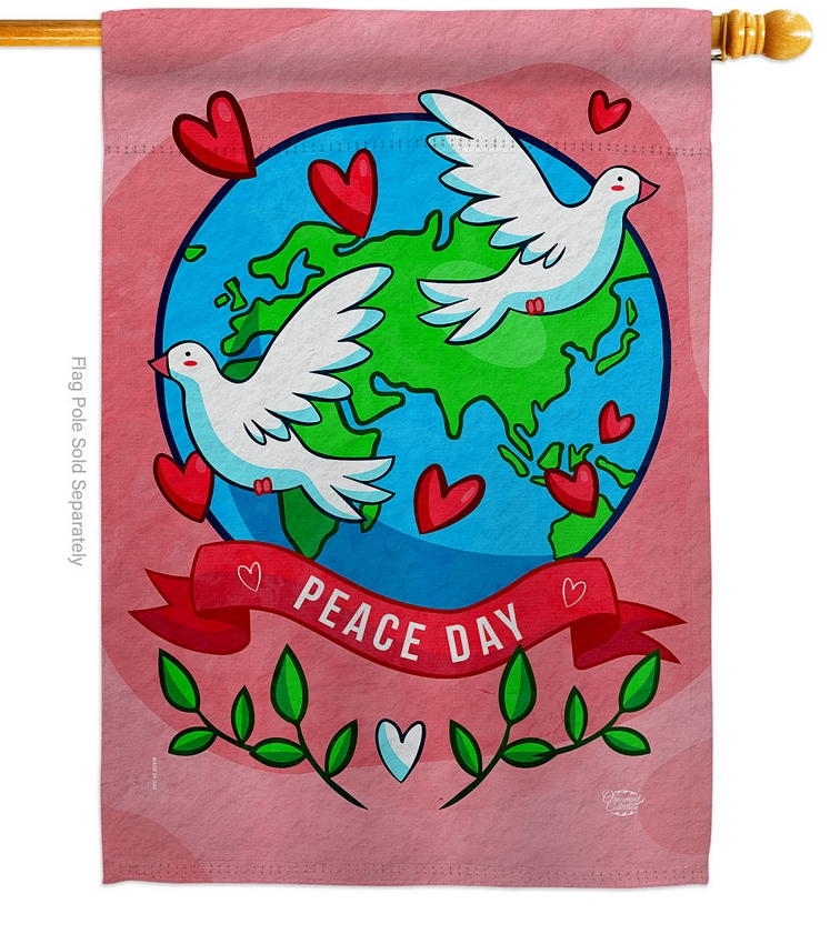 The Peace On Earth Decorative House Flag is a double-sided 28" x 40" house flag designed to be displayed outdoors year-round. Printed on weather-resistant polyester, the flag reads correctly from both approaches so the design works on a yard walkway, a garden bed, or a porch railing. It fits every standard 6-foot house flagpole on the market.