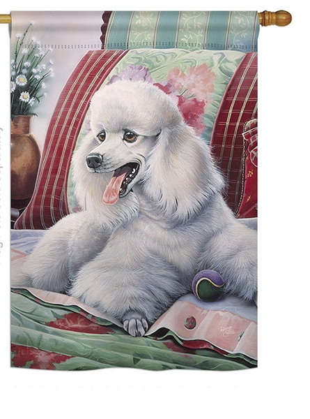 The Poodle House Flag is a double-sided 28" x 40" house flag designed to be displayed outdoors year-round. Printed on weather-resistant polyester, the flag reads correctly from both approaches so the design works on a yard walkway, a garden bed, or a porch railing. It fits every standard 6-foot house flagpole on the market.