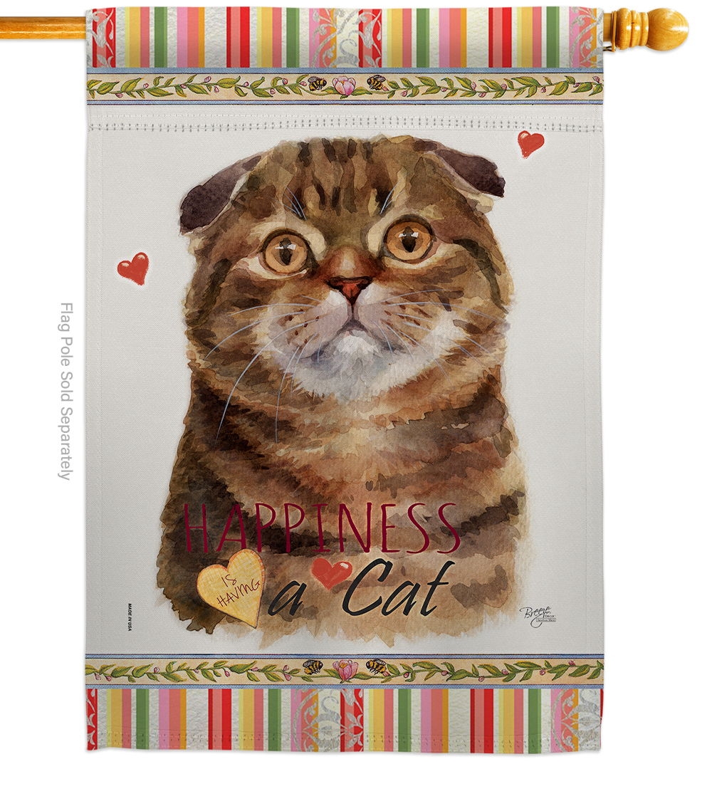 The Scot Fold Happiness House Flag is a double-sided 28" x 40" house flag designed to be displayed outdoors year-round. Printed on weather-resistant polyester, the flag reads correctly from both approaches so the design works on a yard walkway, a garden bed, or a porch railing. It fits every standard 6-foot house flagpole on the market.