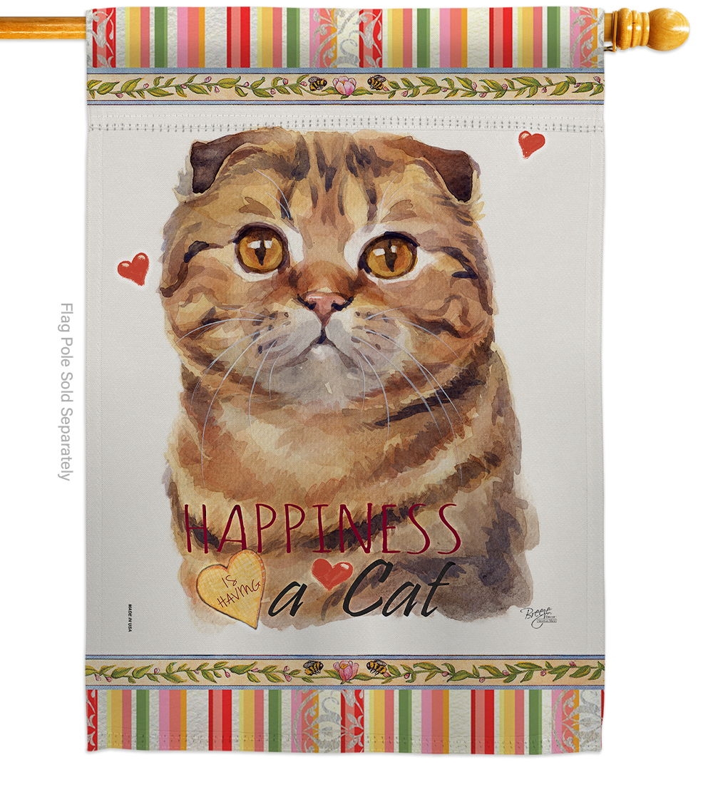 The Scottish Fold Happiness House Flag is a double-sided 28" x 40" house flag designed to be displayed outdoors year-round. Printed on weather-resistant polyester, the flag reads correctly from both approaches so the design works on a yard walkway, a garden bed, or a porch railing. It fits every standard 6-foot house flagpole on the market.