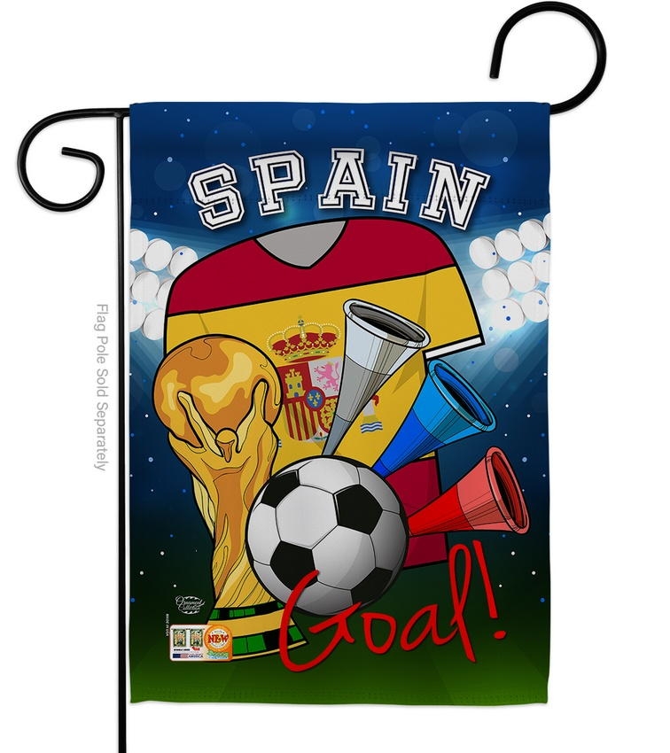 The Spain Soccer Garden Flag is a double-sided 12.5" x 18" garden flag designed to be displayed outdoors year-round. Printed on weather-resistant polyester, the flag reads correctly from both approaches so the design works on a yard walkway, a garden bed, or a porch railing. It fits every standard 40"–46" garden flag stand on the market.