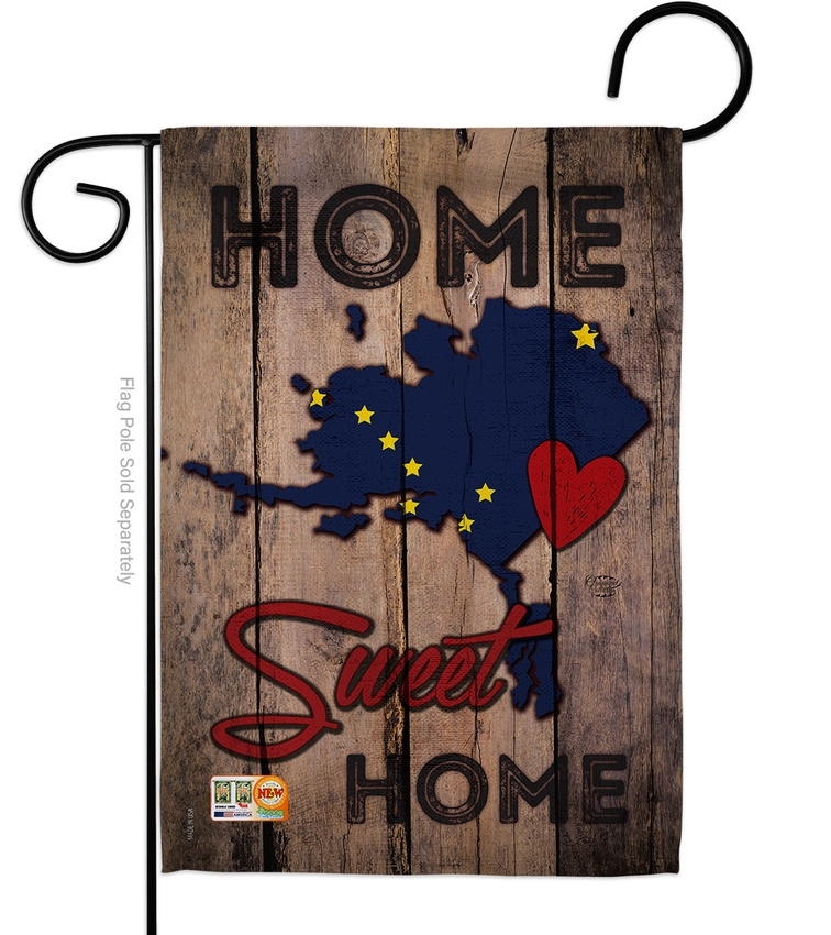 The State Alaska Home Sweet Garden Flag is a double-sided 12.5" x 18" garden flag designed to be displayed outdoors year-round. Printed on weather-resistant polyester, the flag reads correctly from both approaches so the design works on a yard walkway, a garden bed, or a porch railing. It fits every standard 40"–46" garden flag stand on the market.