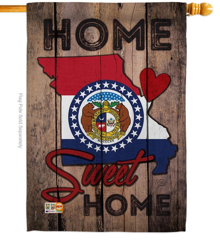 The State Missouri Home Sweet House Flag is a double-sided 28" x 40" house flag designed to be displayed outdoors year-round. Printed on weather-resistant polyester, the flag reads correctly from both approaches so the design works on a yard walkway, a garden bed, or a porch railing. It fits every standard 6-foot house flagpole on the market.