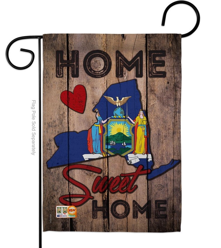 The State New York Home Sweet Garden Flag is a double-sided 12.5" x 18" garden flag designed to be displayed outdoors year-round. Printed on weather-resistant polyester, the flag reads correctly from both approaches so the design works on a yard walkway, a garden bed, or a porch railing. It fits every standard 40"–46" garden flag stand on the market.