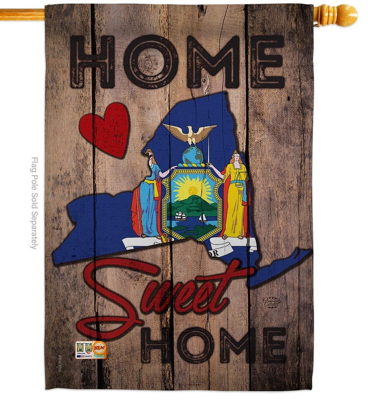 The State New York Home Sweet House Flag is a double-sided 28" x 40" house flag designed to be displayed outdoors year-round. Printed on weather-resistant polyester, the flag reads correctly from both approaches so the design works on a yard walkway, a garden bed, or a porch railing. It fits every standard 6-foot house flagpole on the market.