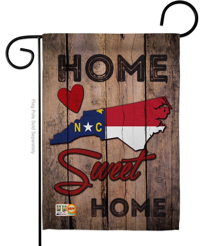 The State North Carolina Home Sweet Garden Flag is a double-sided 12.5" x 18" garden flag designed to be displayed outdoors year-round. Printed on weather-resistant polyester, the flag reads correctly from both approaches so the design works on a yard walkway, a garden bed, or a porch railing. It fits every standard 40"–46" garden flag stand on the market.