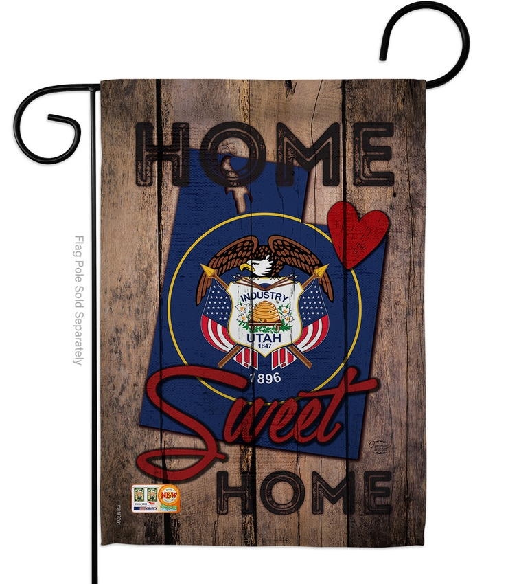 The State Utah Home Sweet Garden Flag is a double-sided 12.5" x 18" garden flag designed to be displayed outdoors year-round. Printed on weather-resistant polyester, the flag reads correctly from both approaches so the design works on a yard walkway, a garden bed, or a porch railing. It fits every standard 40"–46" garden flag stand on the market.
