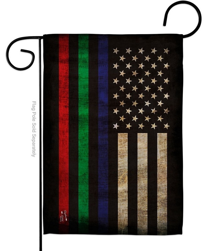 The Thin Blue Green Red Line Garden Flag is a double-sided 12.5" x 18" garden flag designed to be displayed outdoors year-round. Printed on weather-resistant polyester, the flag reads correctly from both approaches so the design works on a yard walkway, a garden bed, or a porch railing. It fits every standard 40"–46" garden flag stand on the market.