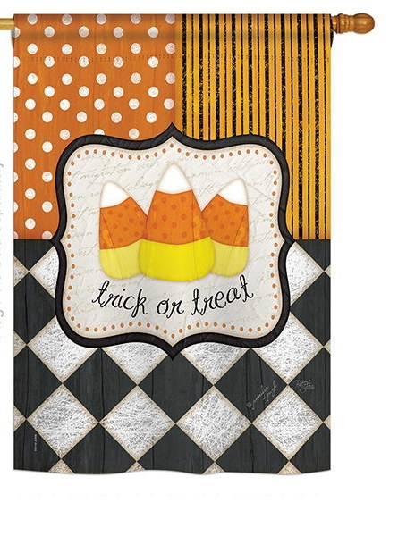 The Trick or Treat House Flag is a double-sided 28" x 40" house flag designed to be displayed outdoors year-round. Printed on weather-resistant polyester, the flag reads correctly from both approaches so the design works on a yard walkway, a garden bed, or a porch railing. It fits every standard 6-foot house flagpole on the market.