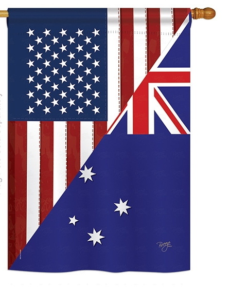 The US Australia Friendship House Flag is a double-sided 28" x 40" house flag designed to be displayed outdoors year-round. Printed on weather-resistant polyester, the flag reads correctly from both approaches so the design works on a yard walkway, a garden bed, or a porch railing. It fits every standard 6-foot house flagpole on the market.