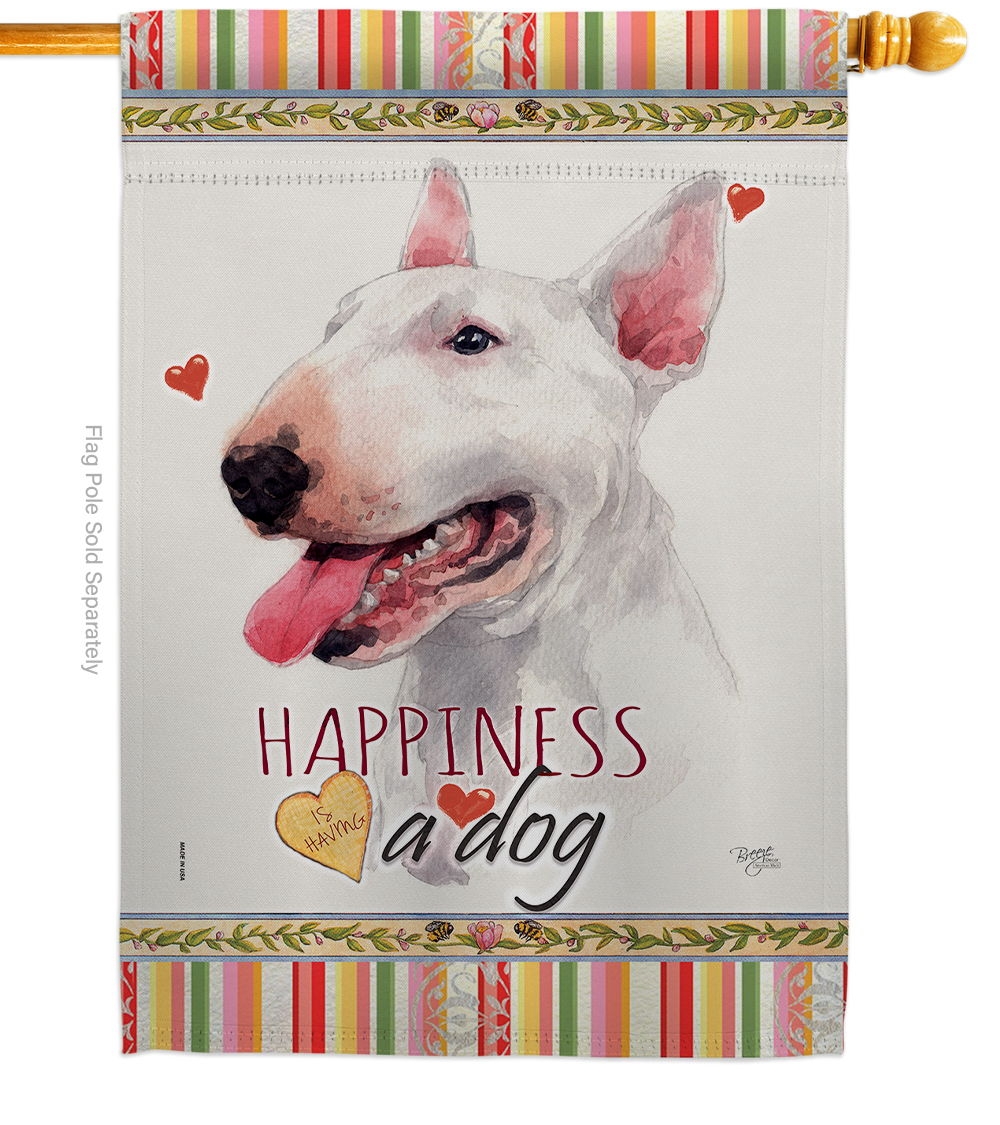 The White Bull Terrier Happiness House Flag is a double-sided 28" x 40" house flag designed to be displayed outdoors year-round. Printed on weather-resistant polyester, the flag reads correctly from both approaches so the design works on a yard walkway, a garden bed, or a porch railing. It fits every standard 6-foot house flagpole on the market.