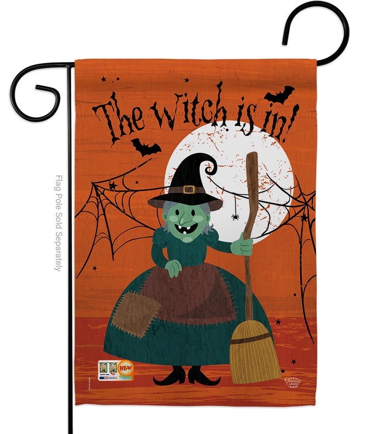The Witch Is In! Garden Flag is a double-sided 12.5" x 18" garden flag designed to be displayed outdoors year-round. Printed on weather-resistant polyester, the flag reads correctly from both approaches so the design works on a yard walkway, a garden bed, or a porch railing. It fits every standard 40"–46" garden flag stand on the market.