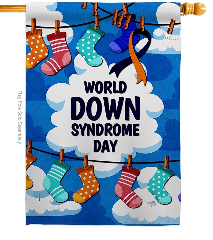 The World Down Syndrome Day House Flag is a double-sided 28" x 40" house flag designed to be displayed outdoors year-round. Printed on weather-resistant polyester, the flag reads correctly from both approaches so the design works on a yard walkway, a garden bed, or a porch railing. It fits every standard 6-foot house flagpole on the market.